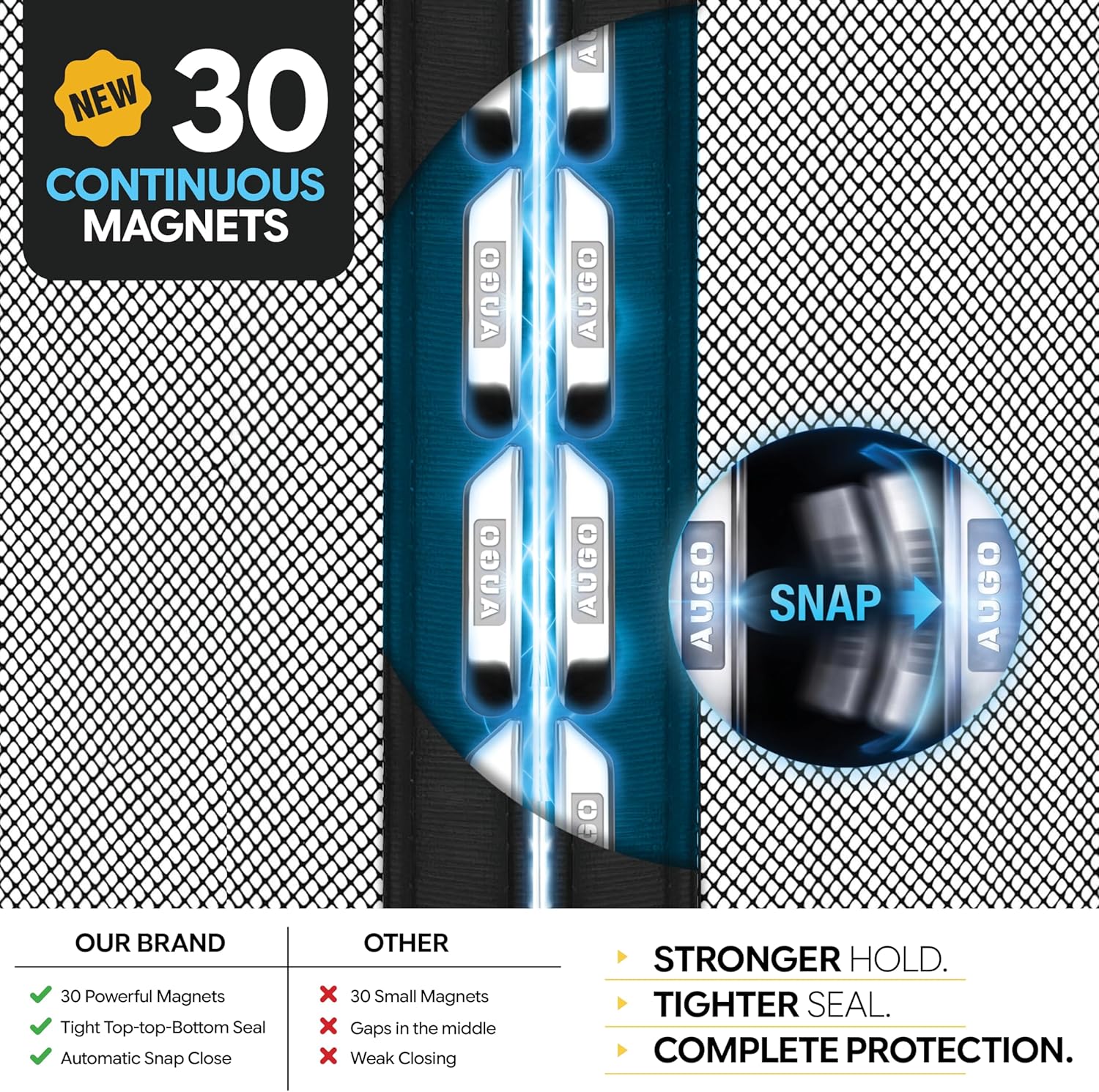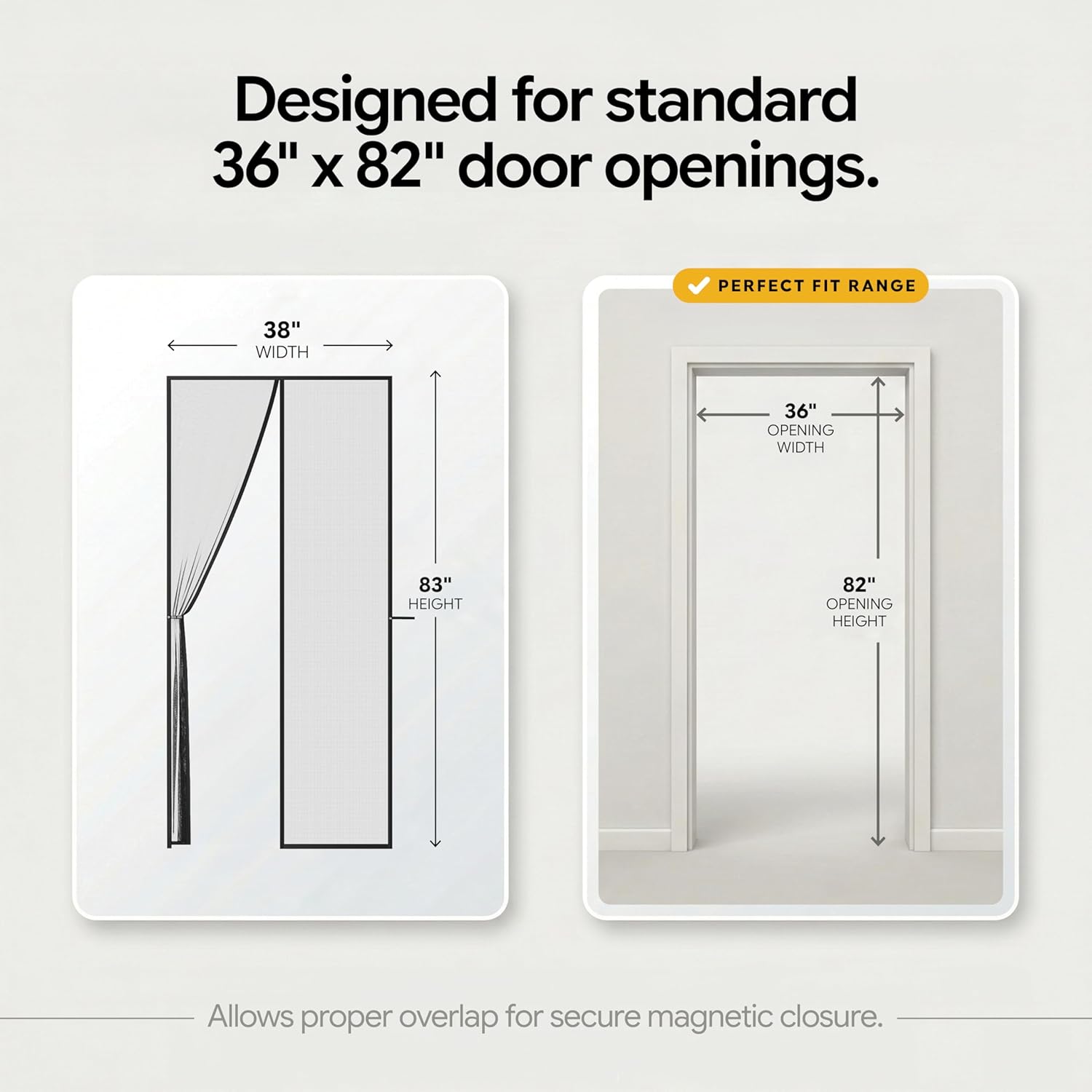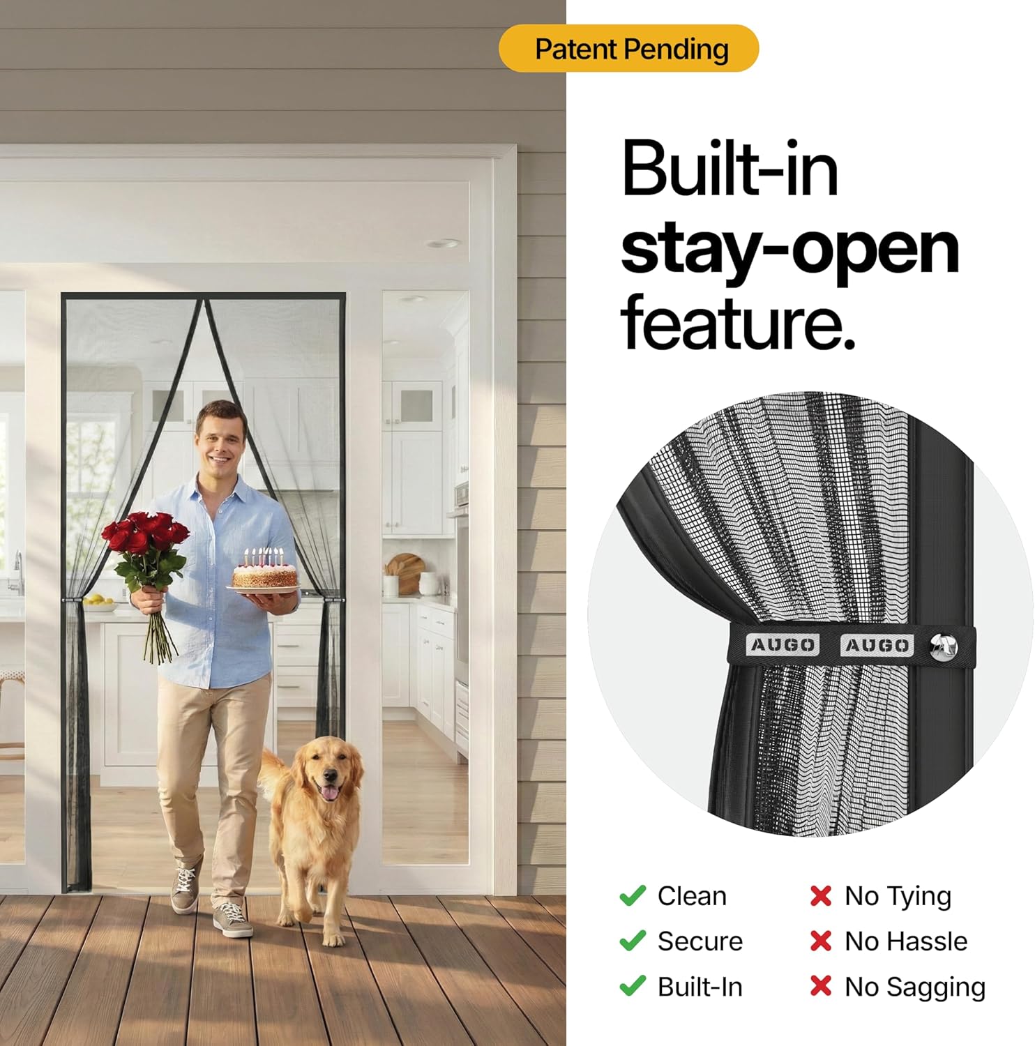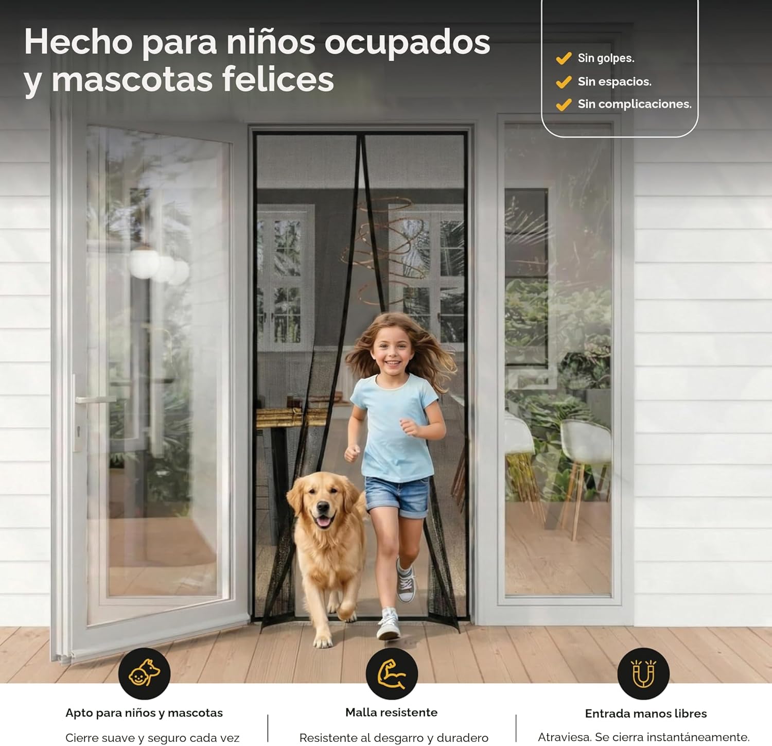Se coloca en el marco de la puerta y queda lista. Cuando pasas, las dos partes se separan y luego los imanes vuelven a juntarse, cerrando la abertura. En la práctica, permite mantener la casa ventilada sin dejar la puerta abierta completamente.